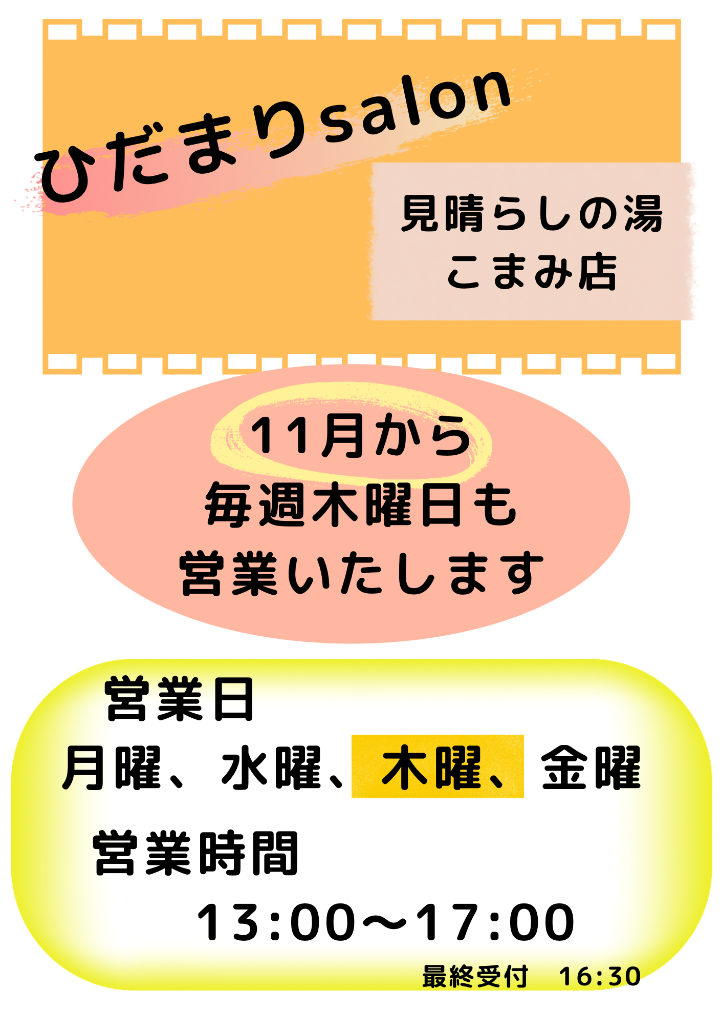 ひだまりsalonは、11月から見晴らしの湯♨️こまみさんでの営業日数を増やして営業しております!